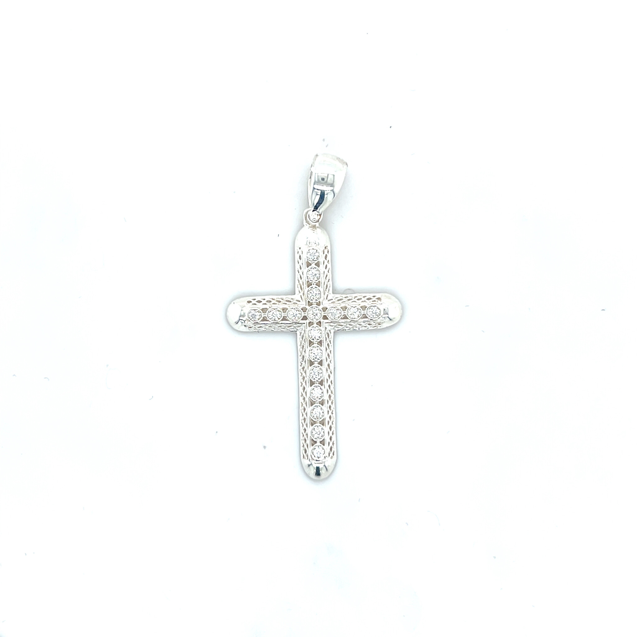 Hanger opengewerkt afgerond kruis bezet met zirkonia's zilver