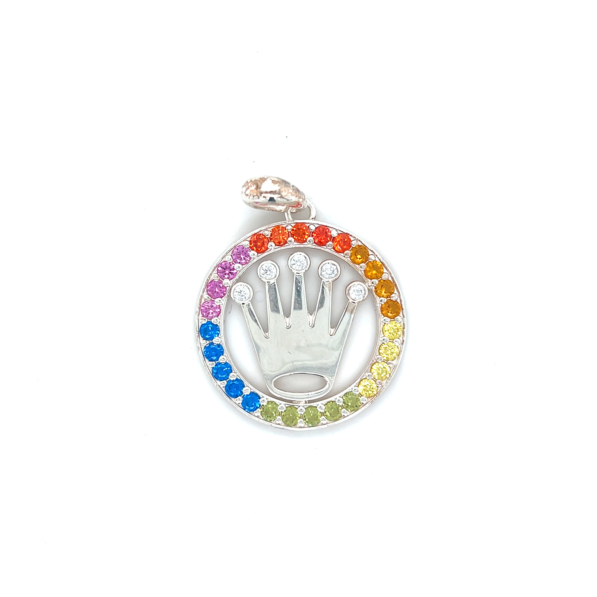 Hanger zilver rond Roleks kroon met regenboog kleurige zirkonia's