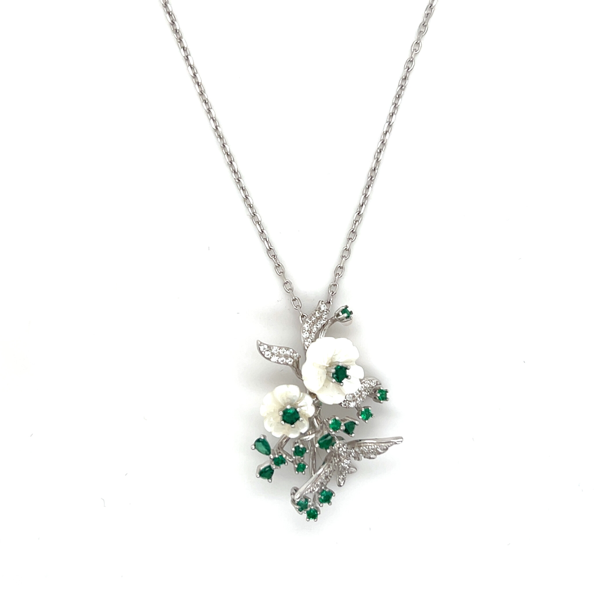 Ketting ankerschakel met fantasie hanger met bloemen, vogels en groene zirkonia's