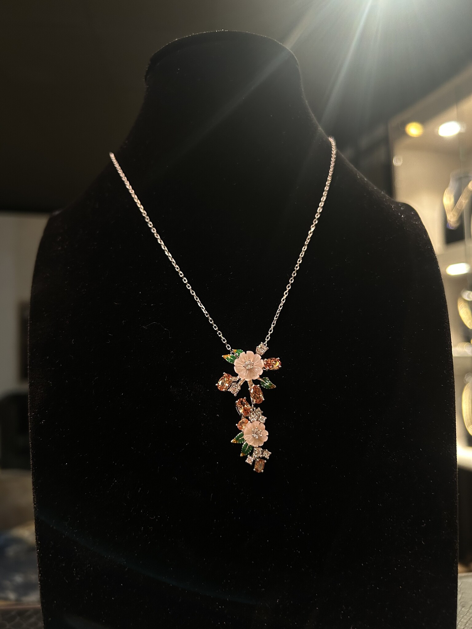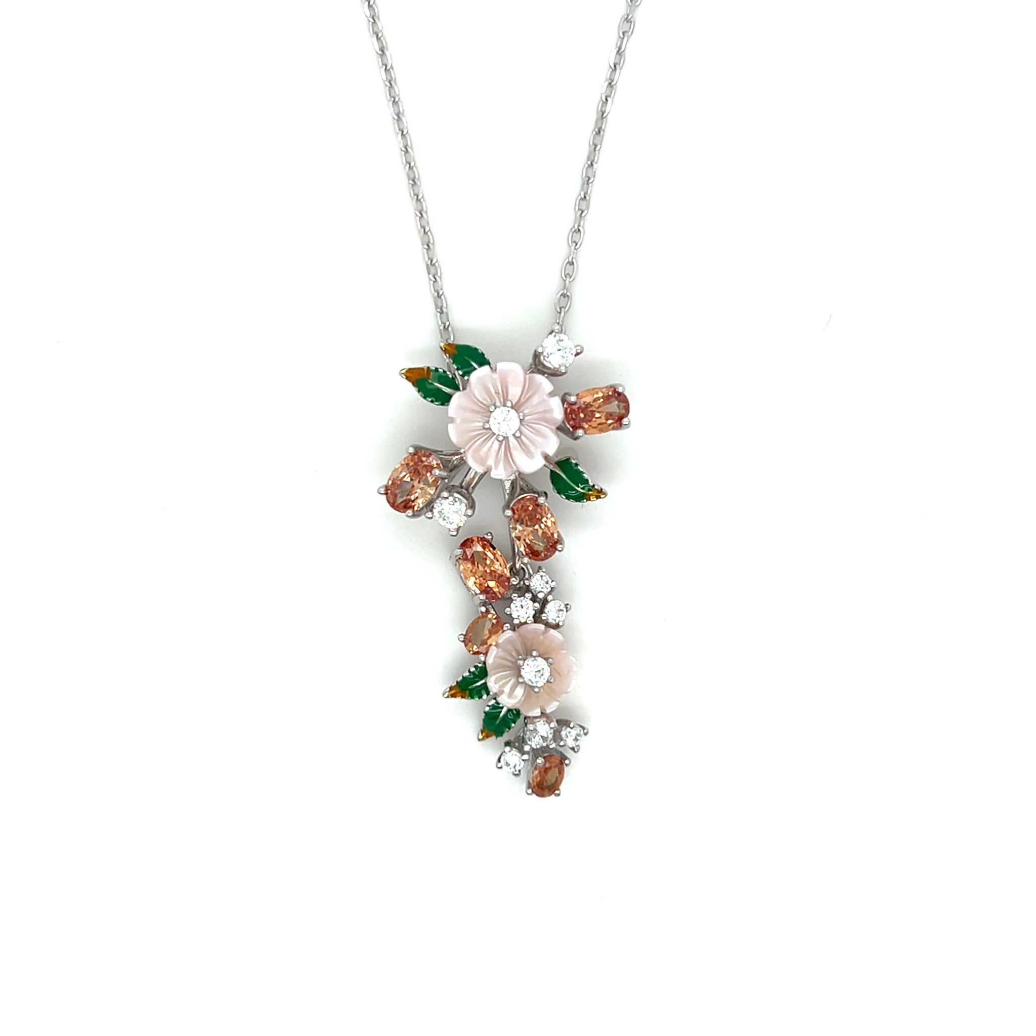 Ketting ankerschakel met hanger oranje, groen en roze bloemen en zirkonia's