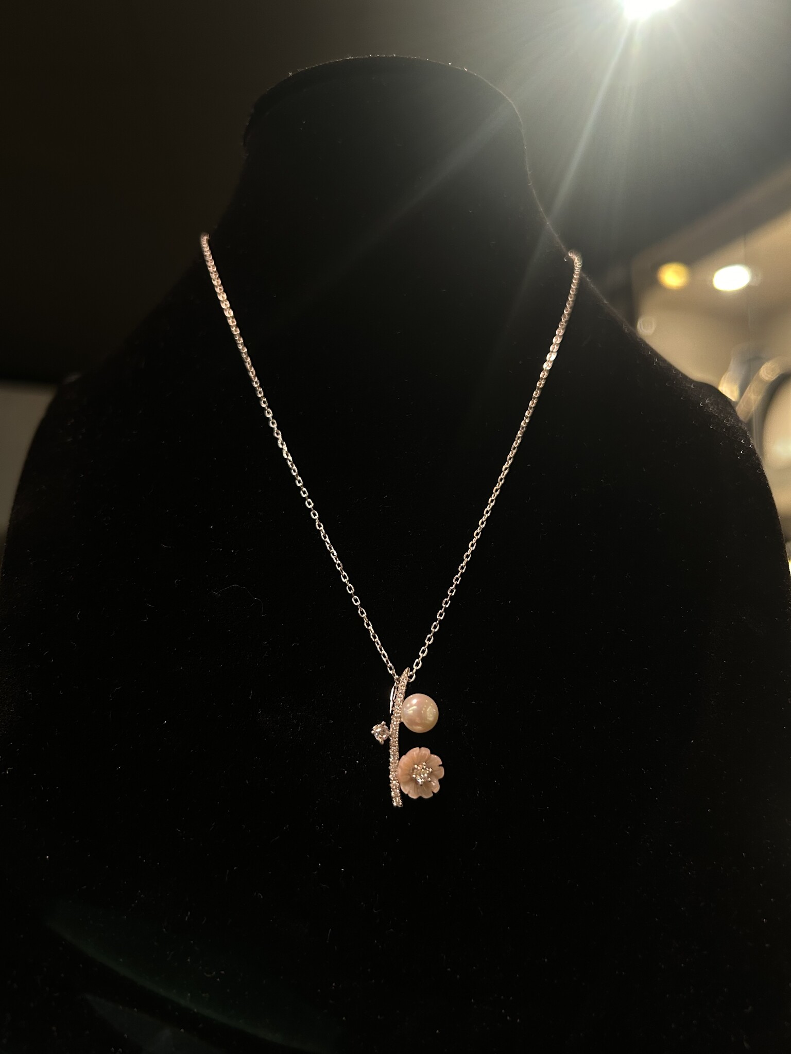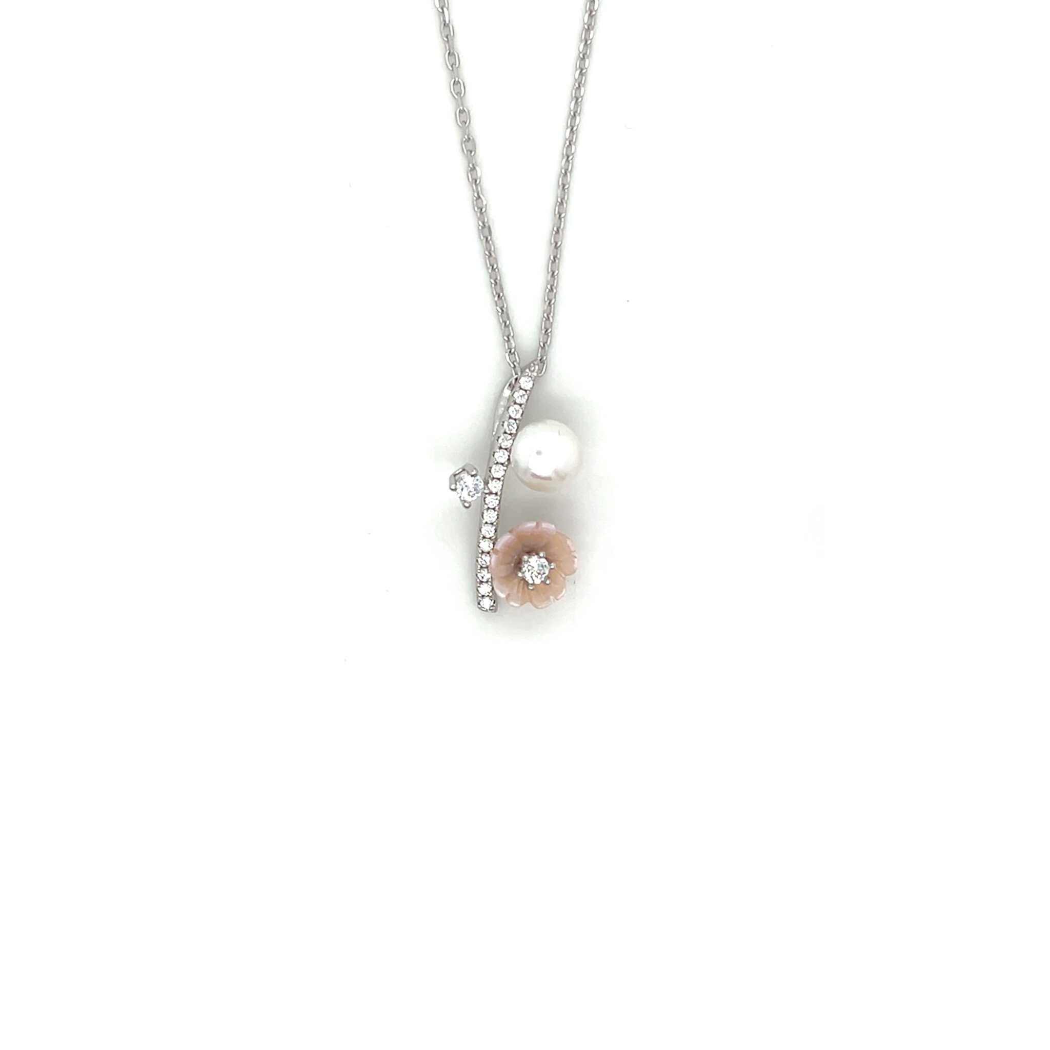 Ketting ankerschakel met staafje, parel en bloemetje en zirkonia's