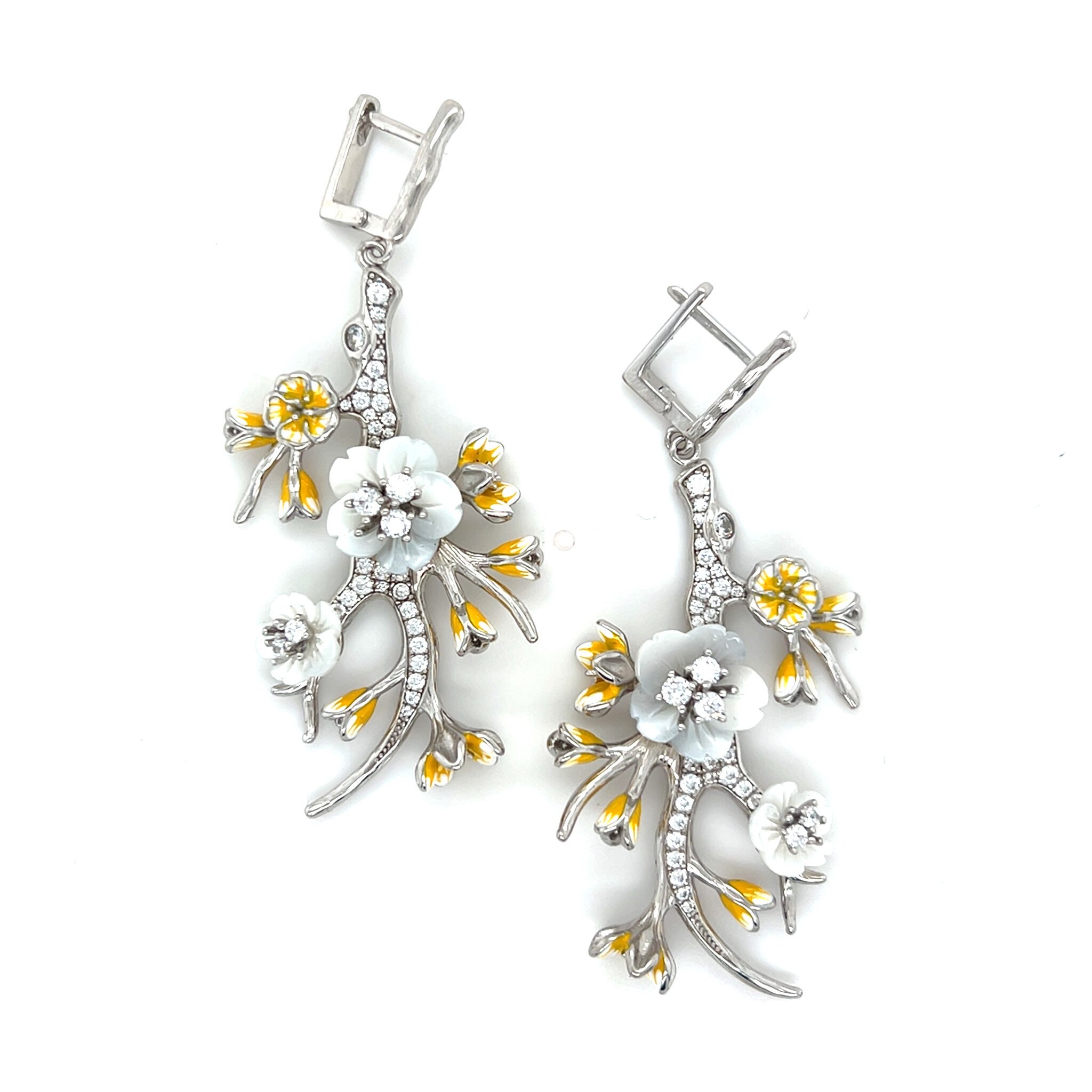Oorbellen takken met gele details, zirkonia's en witte bloemen