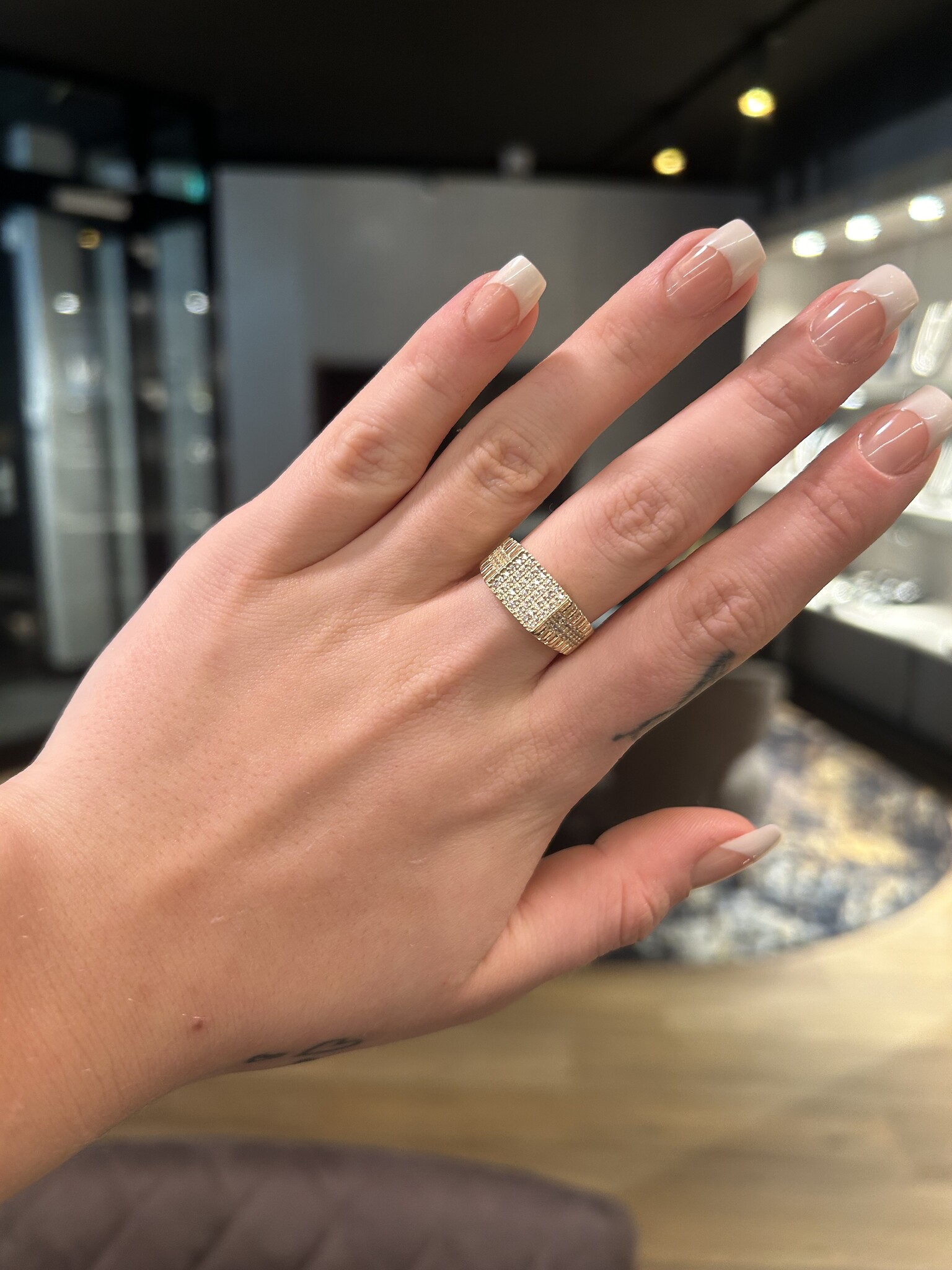 De Rolex ring; al jaren dé nummer 1 ring uit ons assortiment. De Rolex ring is gemaakt van 9 karaat (NIEUW BIJ DGW). De kleur van het sieraad is Nederlands. Dit betekent een iets lichtere kleur. Wil jij meer weten over het verschil tussen Nederlands en Surinaams? Klik dan HIER en lees ons blog die hier over gaat.