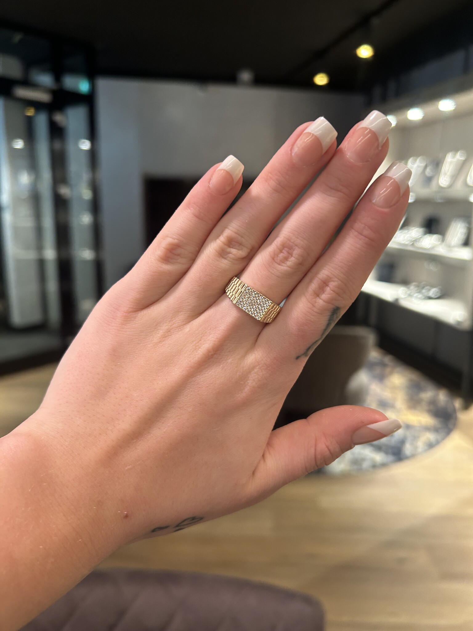 De rolex ring is 6 mm breed en hierdoor erg geschikt om dagelijks gedragen te worden. Door de speelse afwisseling tussen gemateerd en glad krijgt de ring een luxe uitstraling.