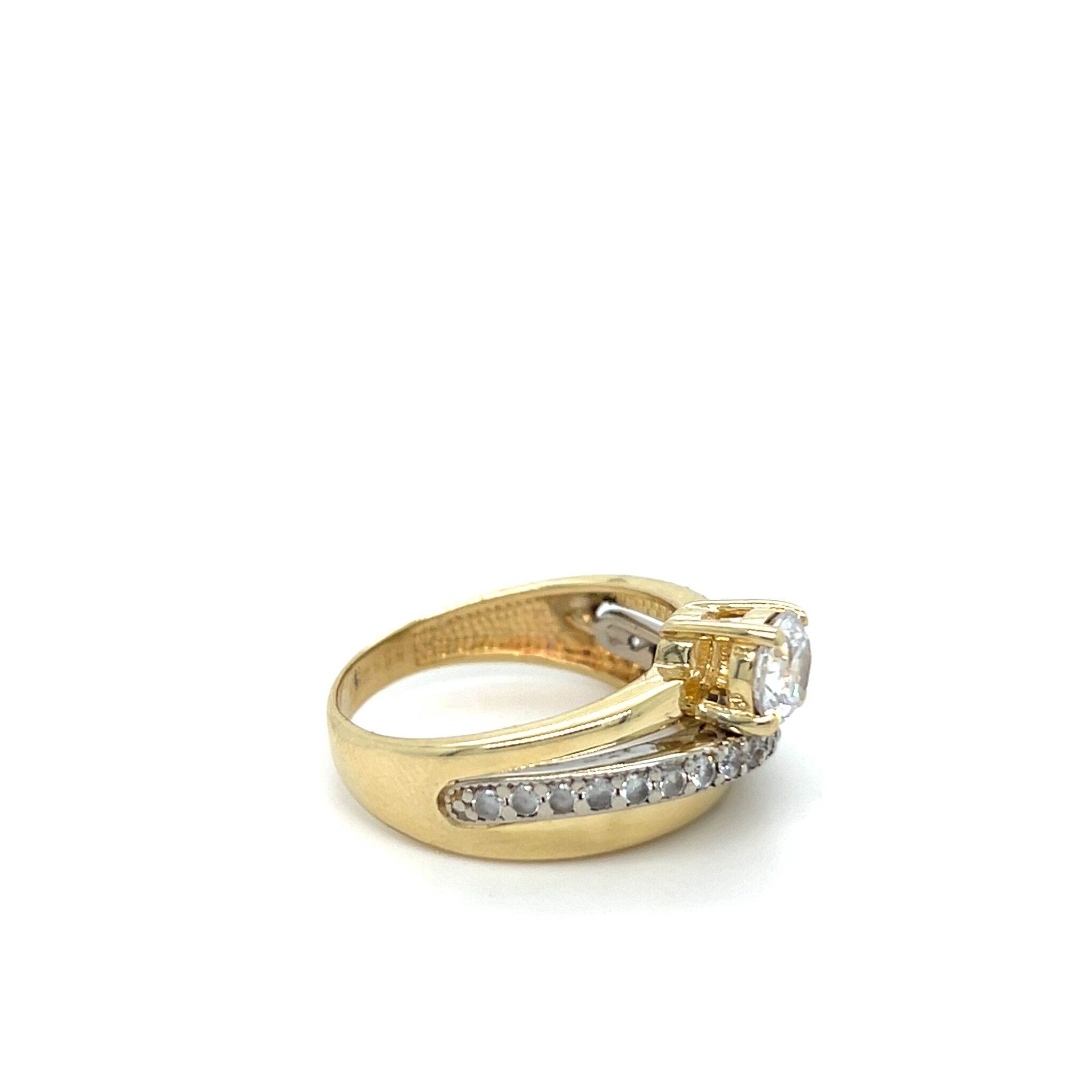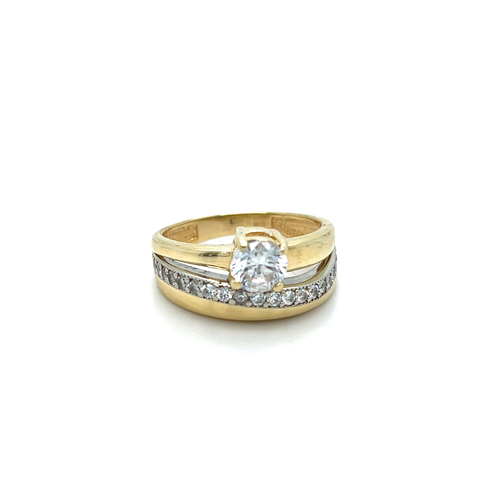 Ring solitair met brede opengewerkte scheen en diagonale sierscheen bezet met zirkonia's