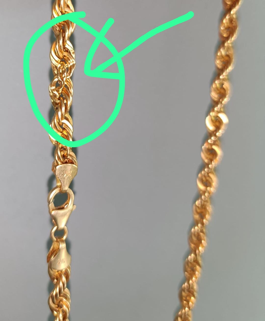 Helaas kan de schakel niet in originele staat vervangen worden. Het is een holle ketting die machinaal gemaakt is. Ons advies is om deze te vervangen. Een vergelijkbare ropechain (19,31 gram en 21kt) zou bij ons een winkelwaarde hebben van 2550 euro.