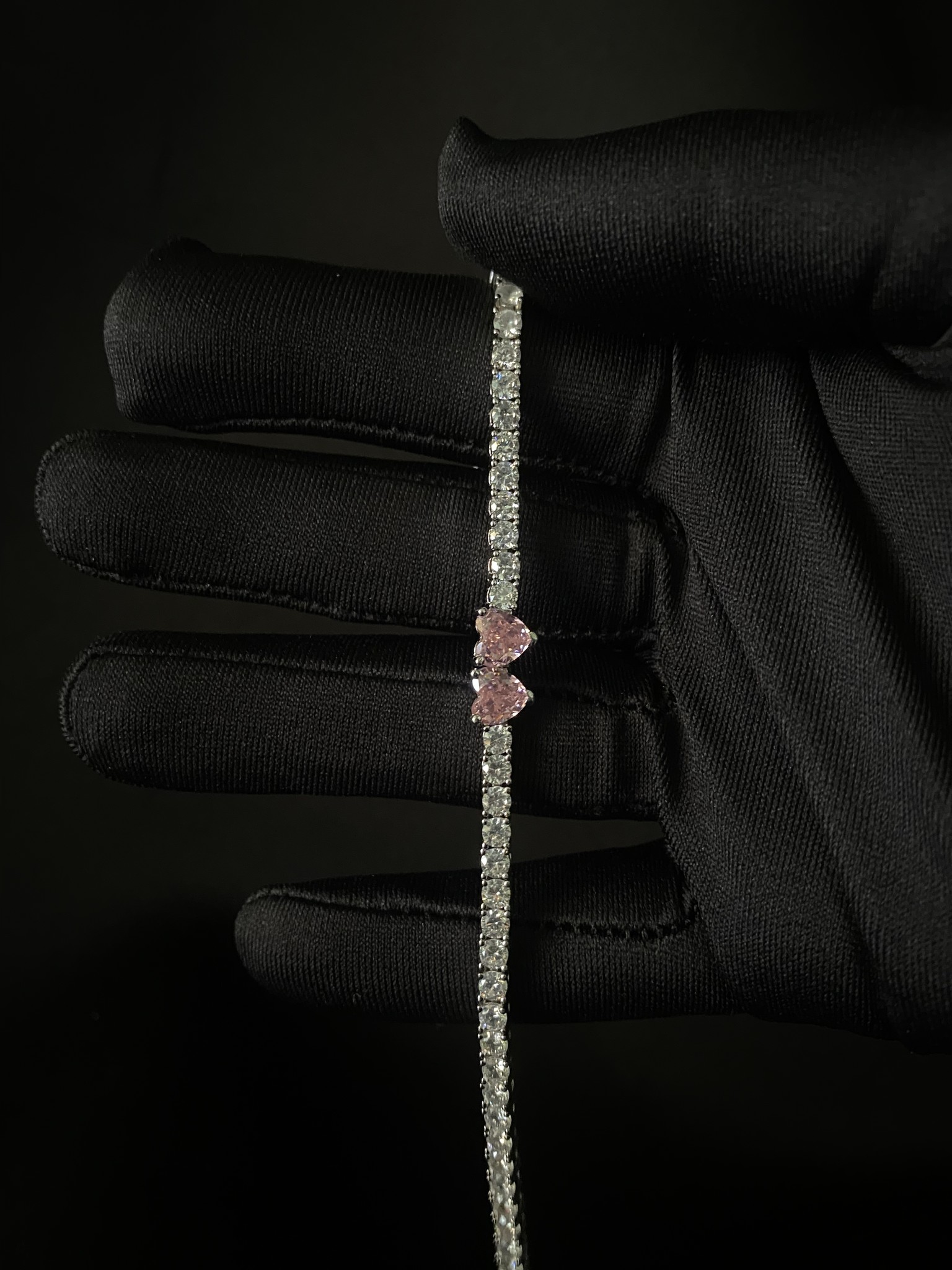 Armband zilver tennisschakel met enkel en dubbel hartje roze